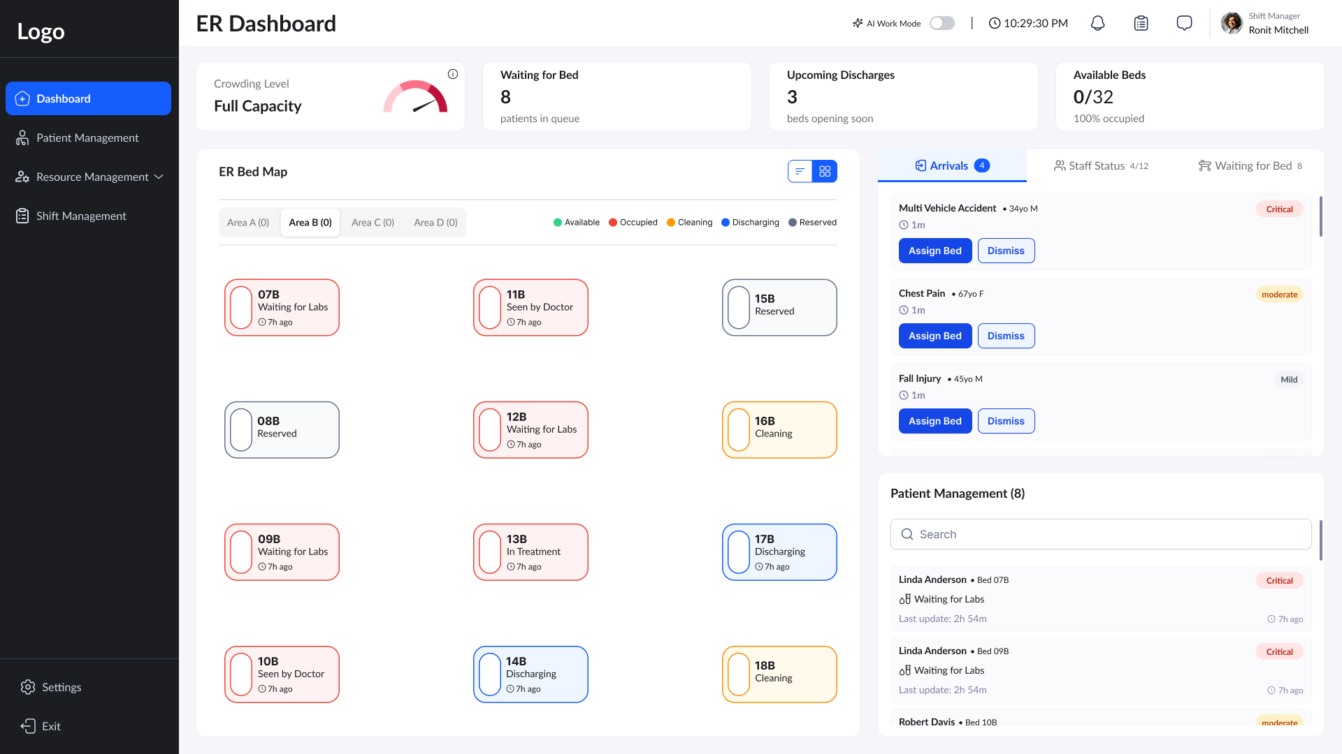 The ER Load Management System’s Shift Manager Dashboard provides real time visibility into patient flow, bed status, and staff availability enabling quick, informed decision making during highpressure
