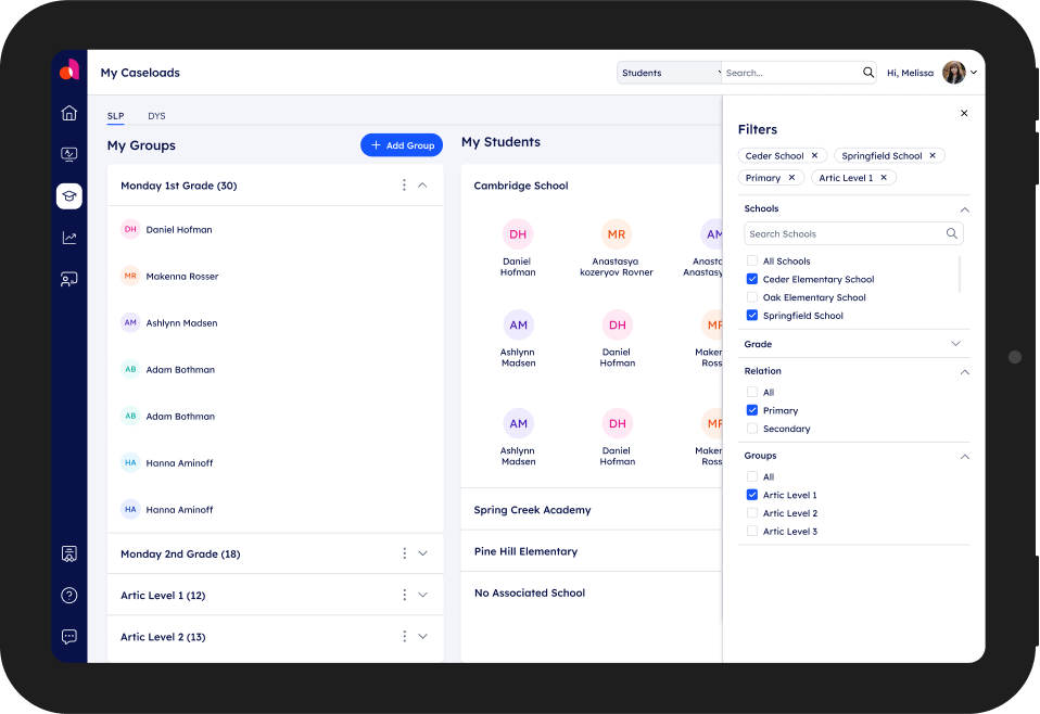 Example of organization screen filtered by Groups and Students